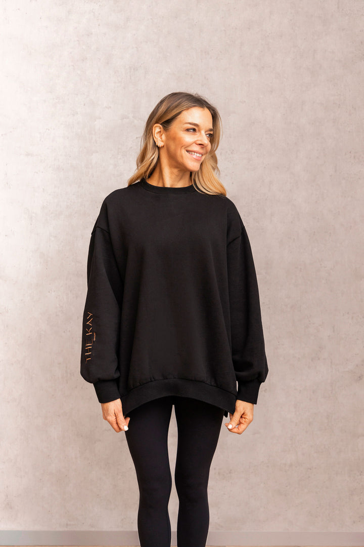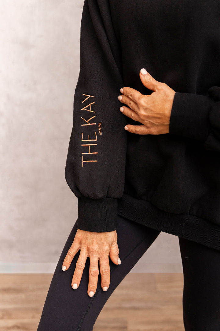 Make a statement AND look amazing in this oversized sweater with side splits and fitted cuffs for that extra classy vibe. Embroidered text on the back and on the sleeve. High quality fabric - you will want to live in this sweater forever.
